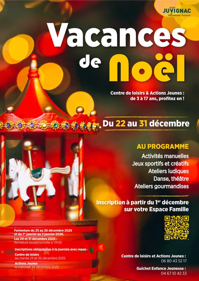 Du 22 au 31 décembre, les équipes d'animateurs du Centre de loisirs (pour les 3-11 ans) et d'Actions Jeunes (pour les 10-17 ans) offriront à l'approche des fêtes un programme d’activités sur le thème de... la fête foraine ! Ouverture des inscriptions le lundi 1er décembre via votre Espace Famille.