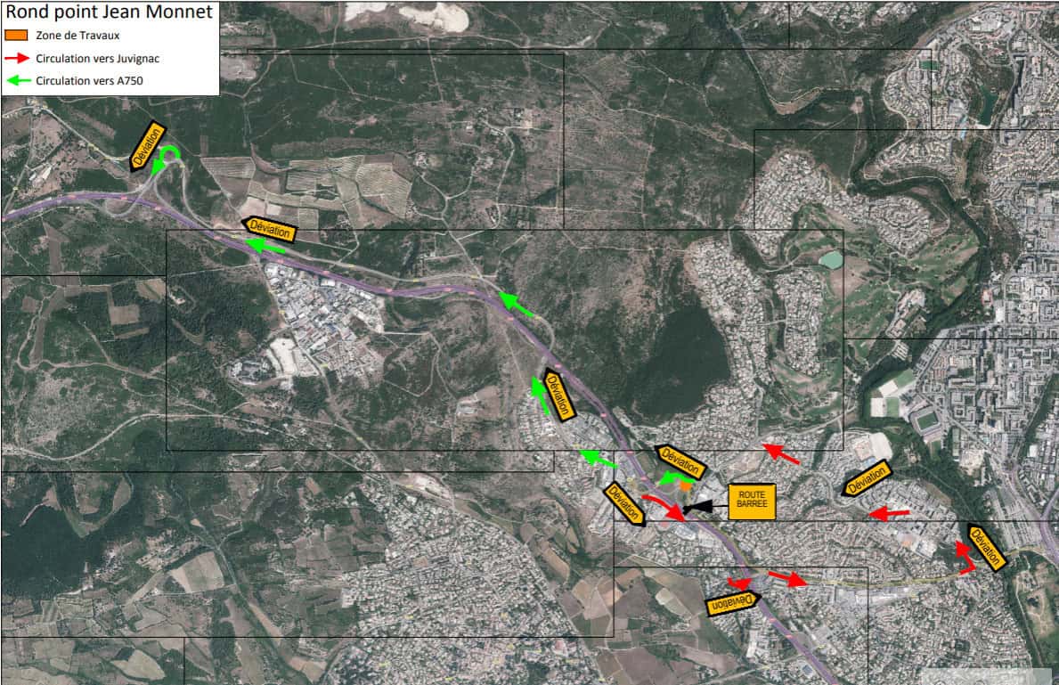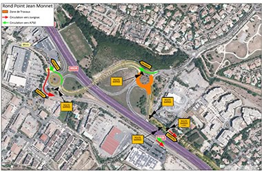 Des panneaux de déviation seront mis en place par l'entreprise Eiffage (voir plan de déviation ci-dessous) et des panneaux d'information sont d'ores et déjà en place sur et aux abords du rond-point concerné.