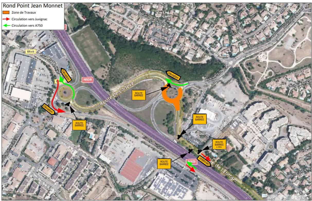 Des travaux de voirie (couches de roulement) sont programmés sur le rond-point Jean Monnet, situé entre les allées de l'Europe et la route de Lodève, dans la nuit du lundi 17 au mardi 18 novembre, à partir de 21h et jusqu'à 5h.