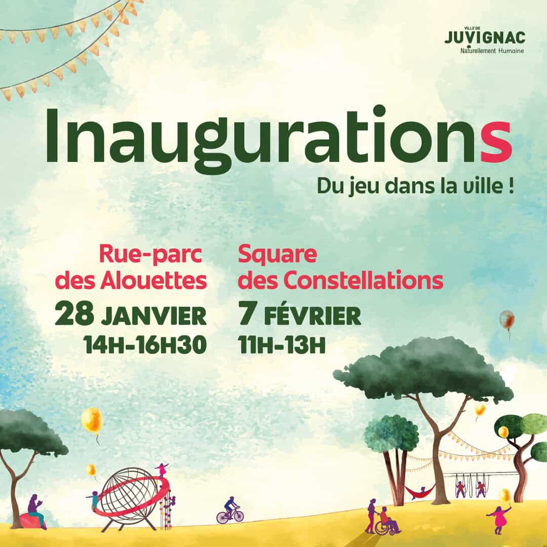 Le 28 janvier et le 7 février 2026, la Ville de Juvignac inaugurera deux aménagements d'intérêt général : la rue-parc des Alouettes (quartier des Garrigues) et le square des Constellations (quartier éponyme) Prenez date !