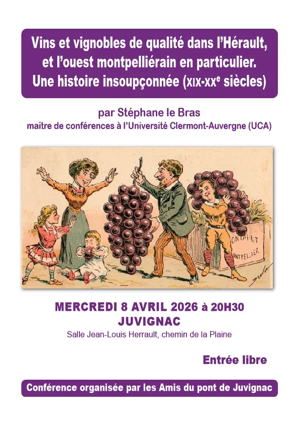 Maître de conférences à l’Université Clermont-Auvergne (UCA) et auteur d'une thèse sur le négoce des vins en Languedoc au XXe siècle, Stéphane Le Bras expliquera comment, au fils des crises, des guerres et des mutations sociales, les terroirs et la commercialisation du vin ont évolué autour de Montpellier et Sète, à travers une conférence intitulée : « Vins et vignobles de qualité dans l’Hérault, et l’ouest montpelliérain en particulier. Une histoire insoupçonnée (XIXe-XXe siècles) ».