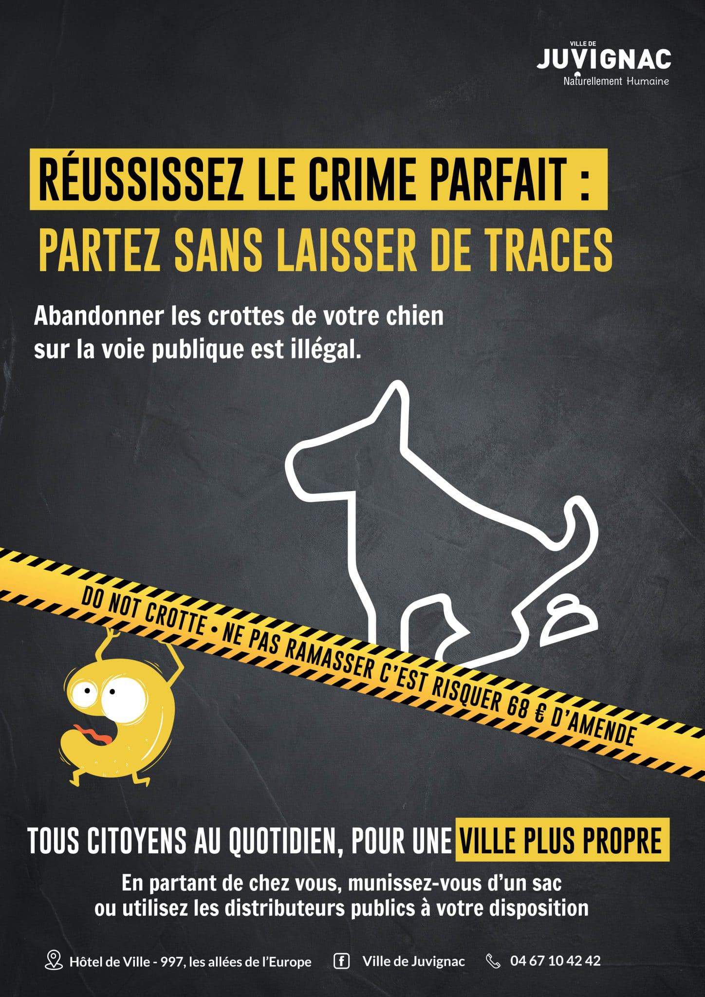 5 novembre 2021La Ville de Juvignac dévoile un nouveau volet de sa campagne au long cours sur la propreté urbaine, déployée depuis le début de l’année 2021. Dans le viseur, cette fois-ci : les déjections canines. Le mot d’ordre, lui, reste le même : tous citoyens au quotidien pour une ville plus propre !
