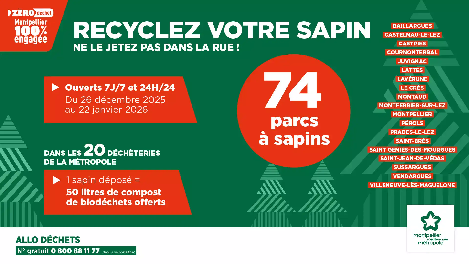 Après les fêtes, n’abandonnez pas votre sapin de Noël: offrez-lui une seconde vie ! Du 26 décembre 2025 au 21 janvier 2026, à l’initiative de Montpellier Méditerranée Métropole, 4 parcs à sapins seront à votre disposition à Juvignac 7j/7 et 24h/24.
