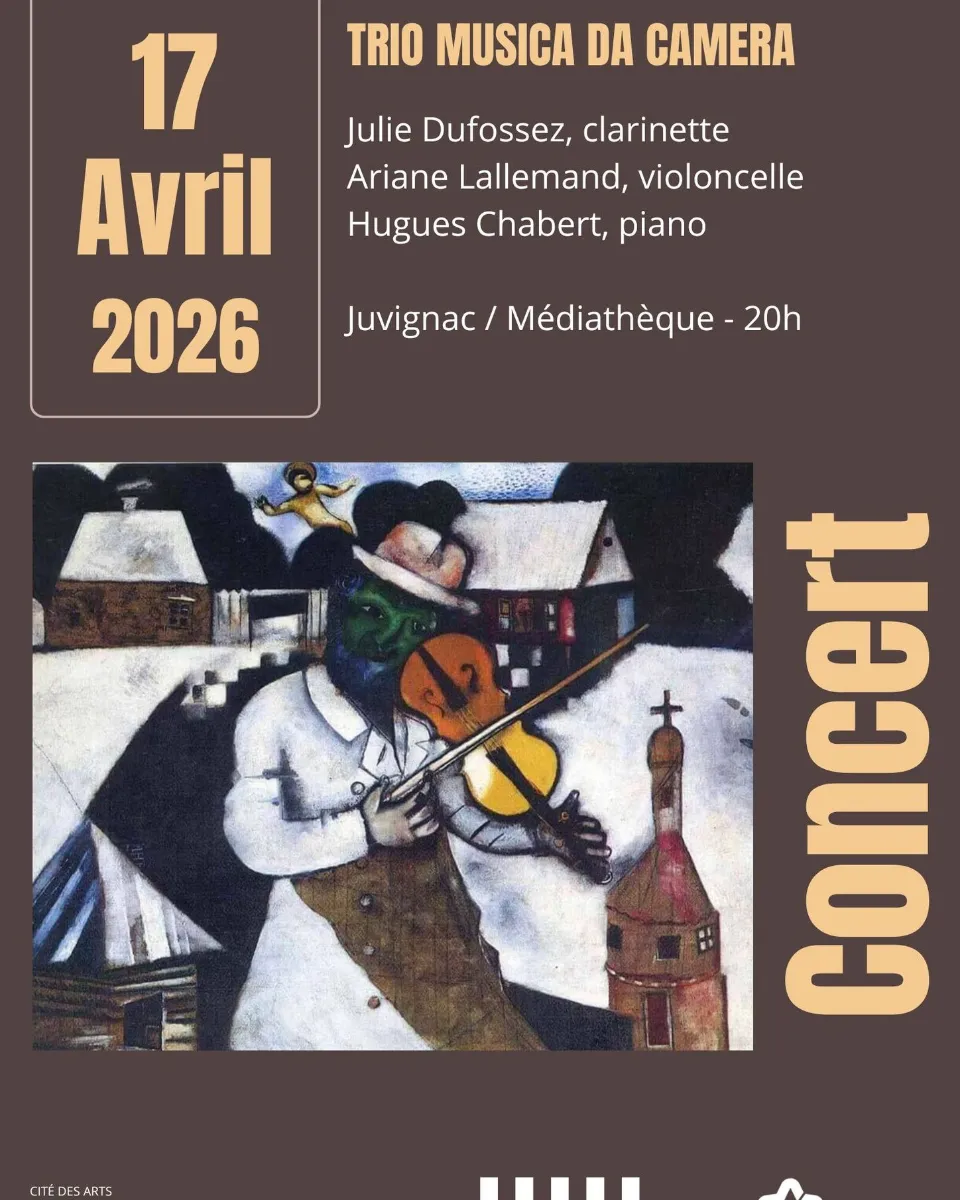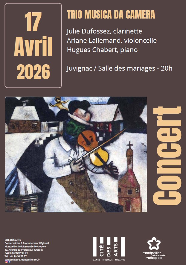 Les professeurs de la Cité des Arts reviennent sur le devant de la scène juvignacoise pour un moment musical plein de promesses : Jules Dufossez, Ariane Lallemand et Hugues Chabert vous proposent un concert en trio (respectivement clarinette, violoncelle et piano).