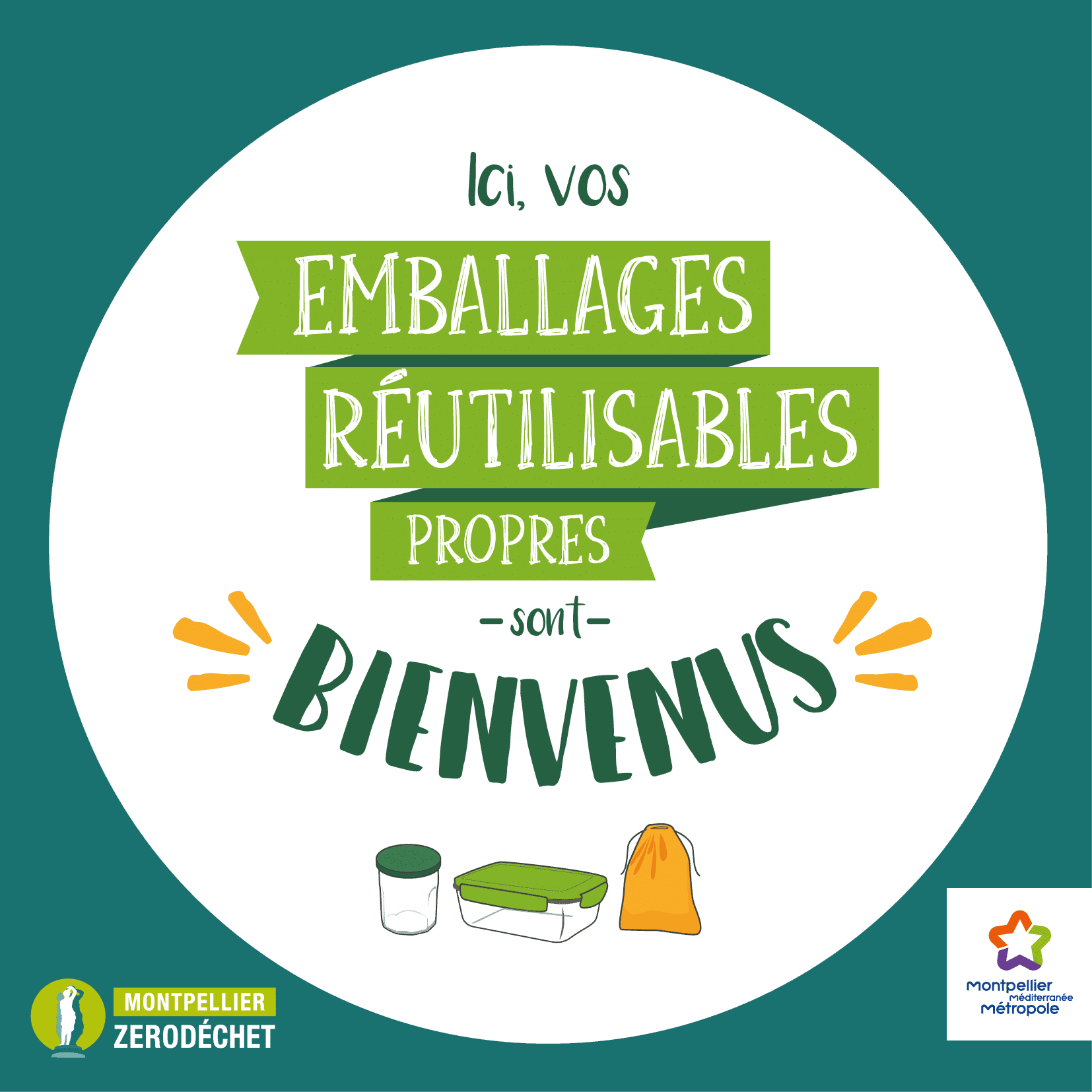Dans ce cadre, Montpellier Méditerranée Métropole met à disposition des habitants un autocollant «Ici vos emballages réutilisables propres sont bienvenus » à distribuer dans les commerces alimentaires de proximité, qui seront invités à les rendre visibles en caisse ou en vitrine.